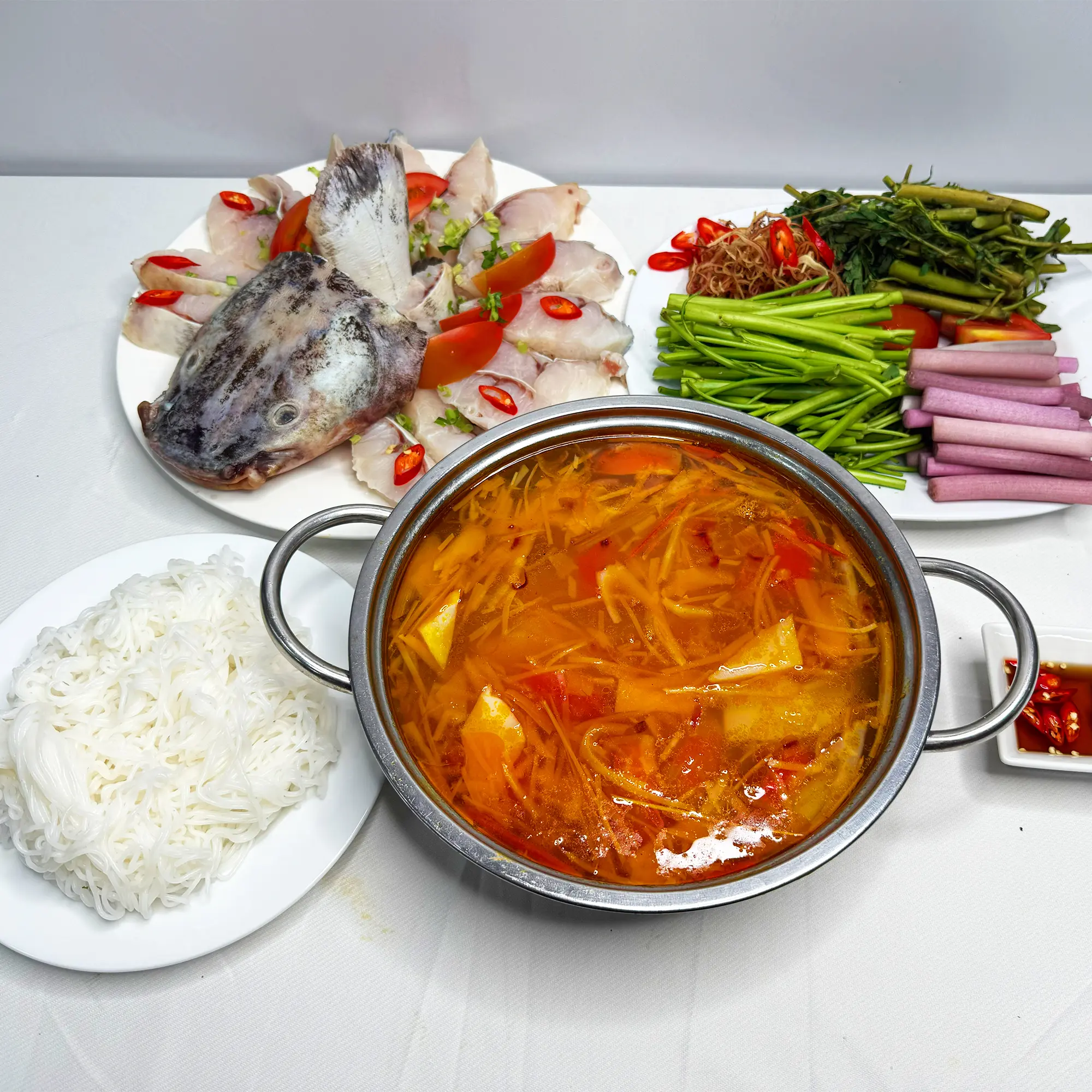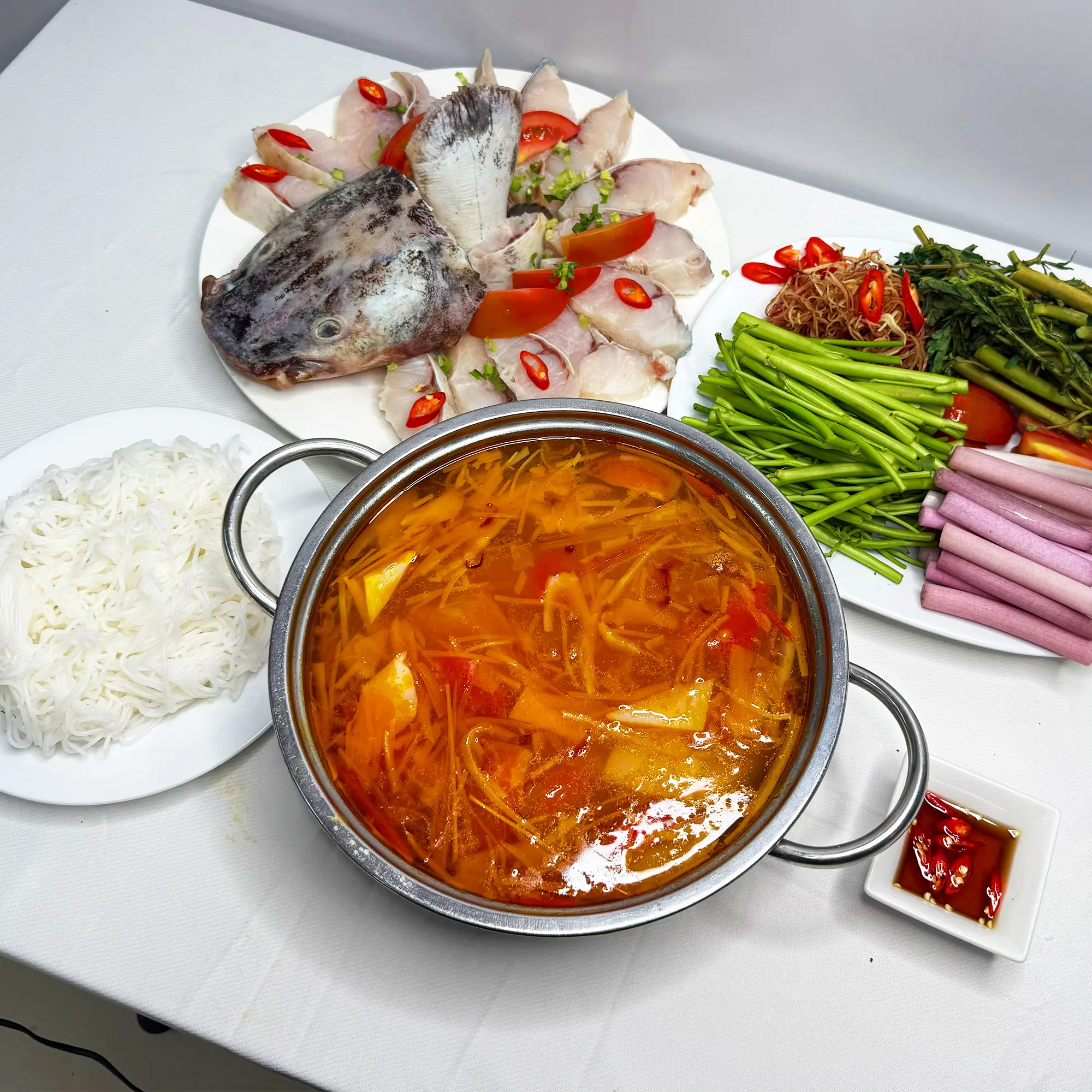 Lẩu cá lăng măng chua là món ăn hấp dẫn, phù hợp cho những bữa tiệc sum họp gia đình hay liên hoan bạn bè. Nước lẩu 3L được ninh nấu kỹ lưỡng, mang vị chua thanh tự nhiên từ măng, kết hợp cùng gia vị đậm đà, tạo nên hương thơm đặc trưng và kích thích vị giác ngay từ lần đầu thưởng thức.